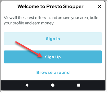 To sign up for a PrestoShopper account, go to the Presto map (http://prestomap.com) in any mobile browser. Click the menu button in the upper left hand corner of the screen and click Signup: