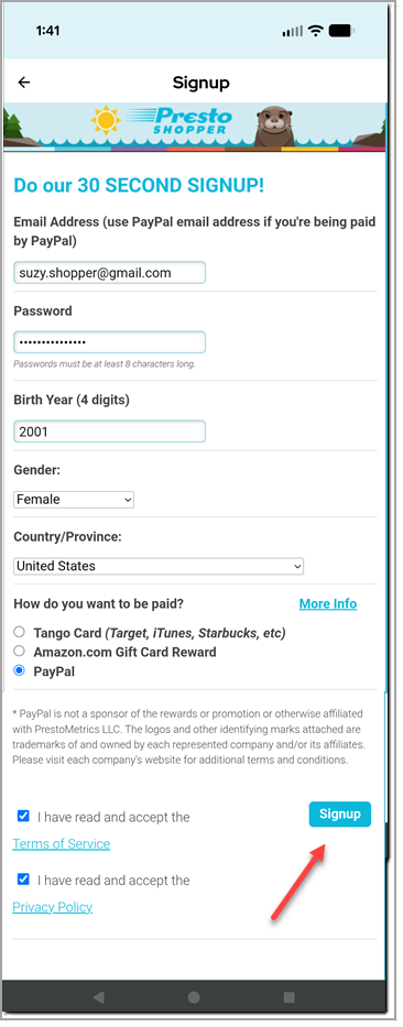 Fill out the form to create your Presto account and click Signup at the bottom of the page.