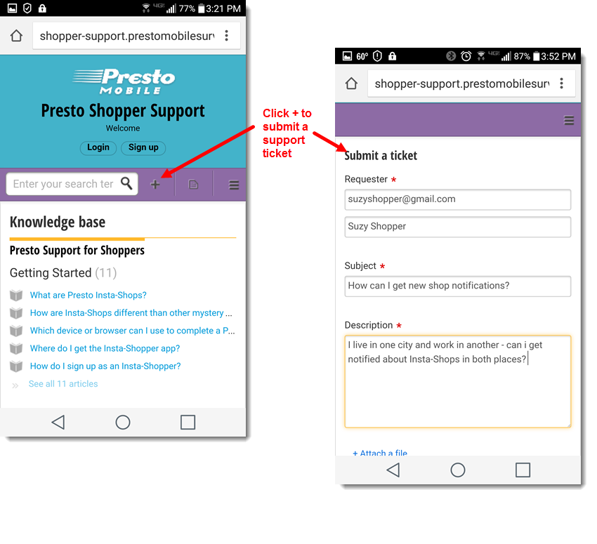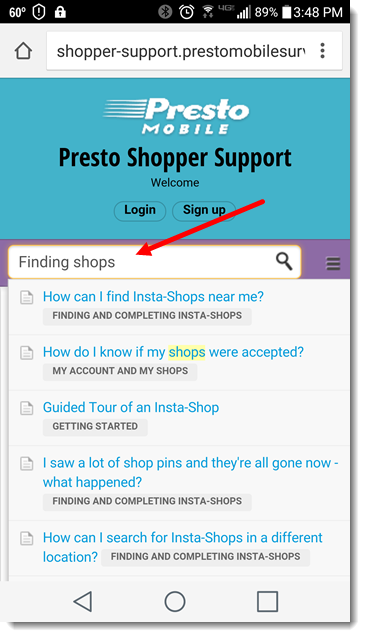 The best (and fastest) place to get help with Presto Insta-Shops is our knowledge base (at http://shopper-support.prestomobilesurveys.com, or by clicking the menu icon in the upper left hand corner of the Presto map/Presto app and then selecting Help: