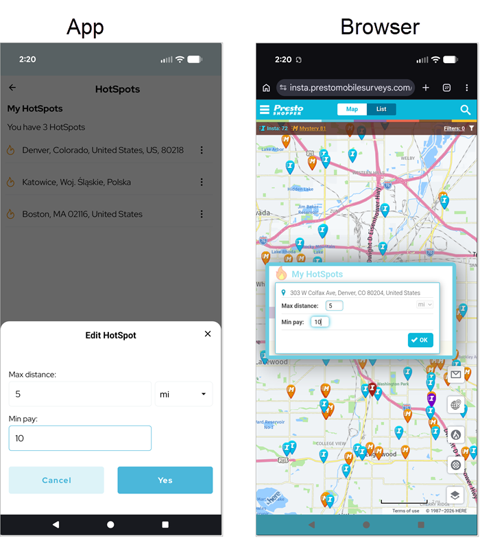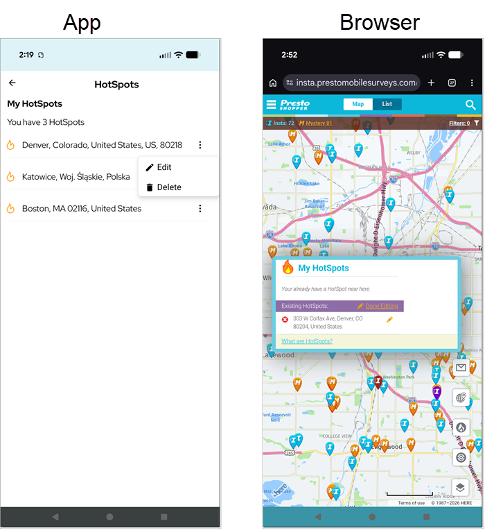 Setting up a hotspot means that you will now receive a daily Presto shop email anytime there are shops near your hotspot. You can set up multiple hotspots. You can also limit the notifications you get based on pay, distance or both. - To edit or delete an existing hotspot, click the hotspot icon on the right hand side of the map. If you are using a browser, click on the three dots to the right of the hotspot you want to edit and then click Edit. If you are using a browser, click Edit Hotspots and then click the pencil icon next to the hotspot that you want to edit. You can also click the trash can Delete icon (app) or X (browser) to delete the hotspot.