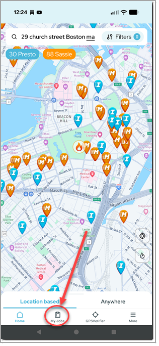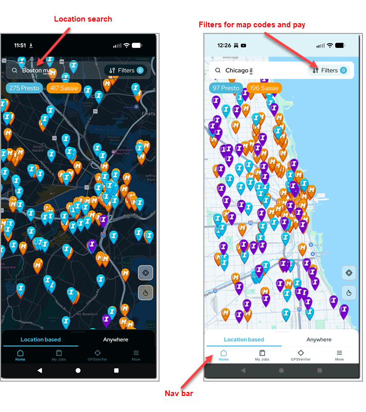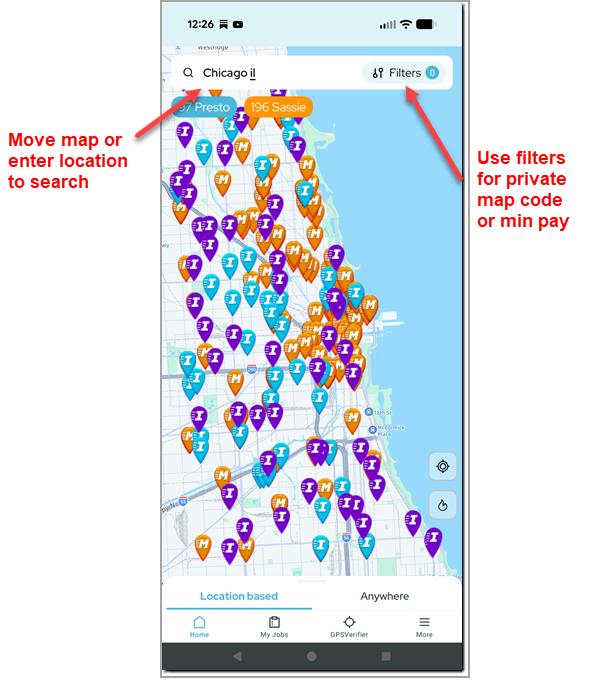 If you've already been using the Insta-Shopper app, you should have an easy time getting used to the new app. The map looks the same (although it is now available in light and dark themes) and has the same location search bar at the top, and filters for minimum pay and private map codes: