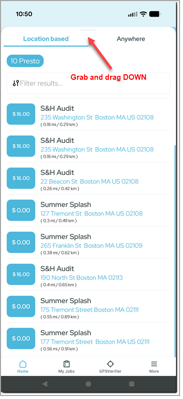 To return to map view, grab the top bar of the list view (where it says Location based/Anywhere) and pull down: